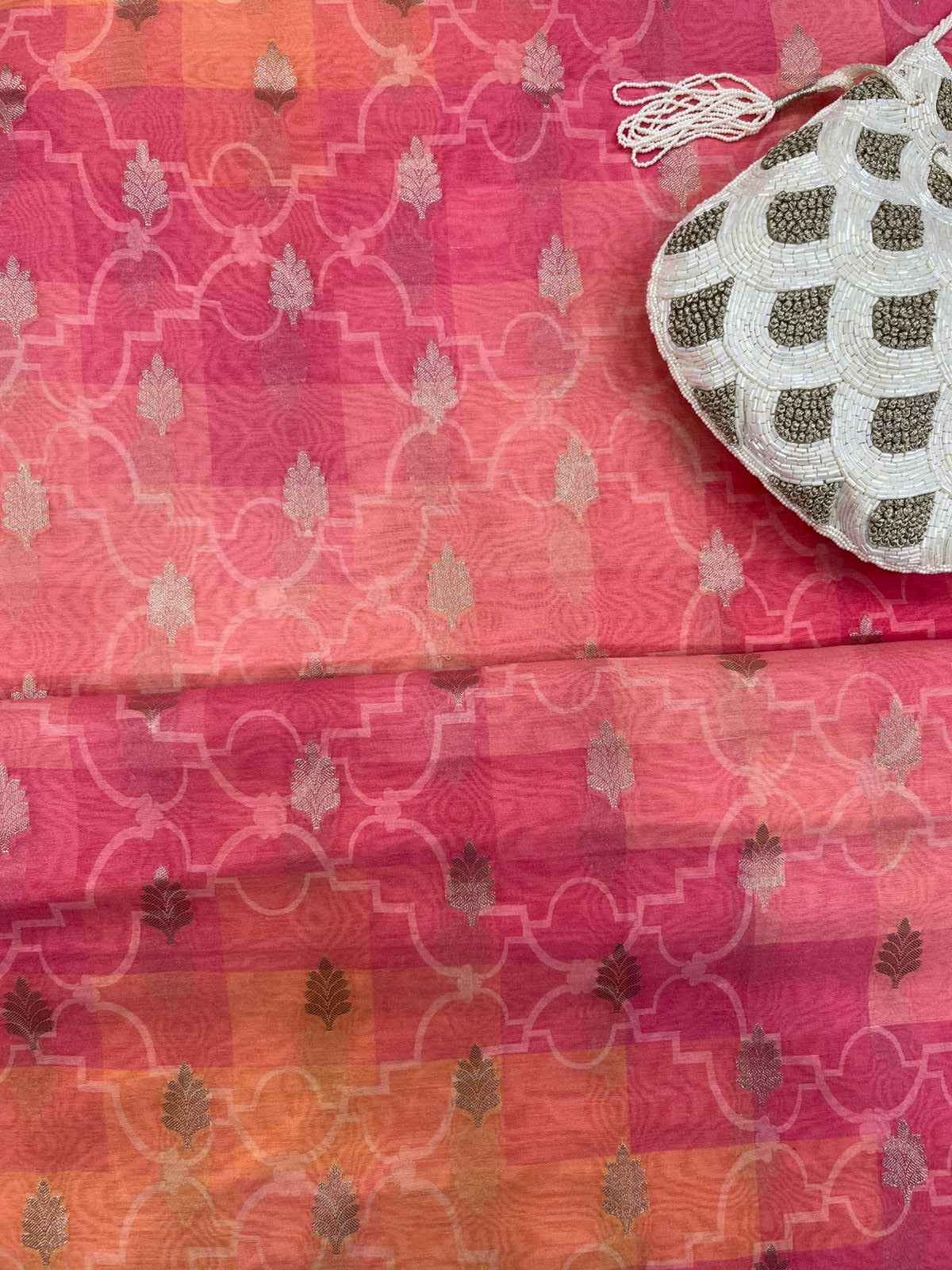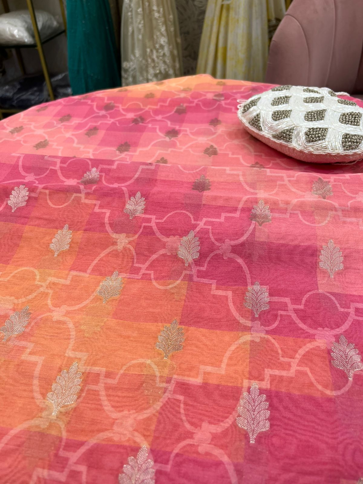 This is a stunning Chanderi fabric featuring a beautiful blend of warm tones—from deep rose pink to peach and soft orange—arranged in a soft gradient or checkered base. The fabric is adorned with zari butti (motifs), intricately woven in shimmering metallic threads, typically gold or silver, creating elegant leaf patterns spaced across the fabric.