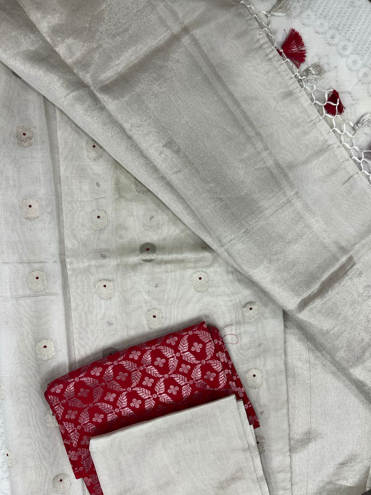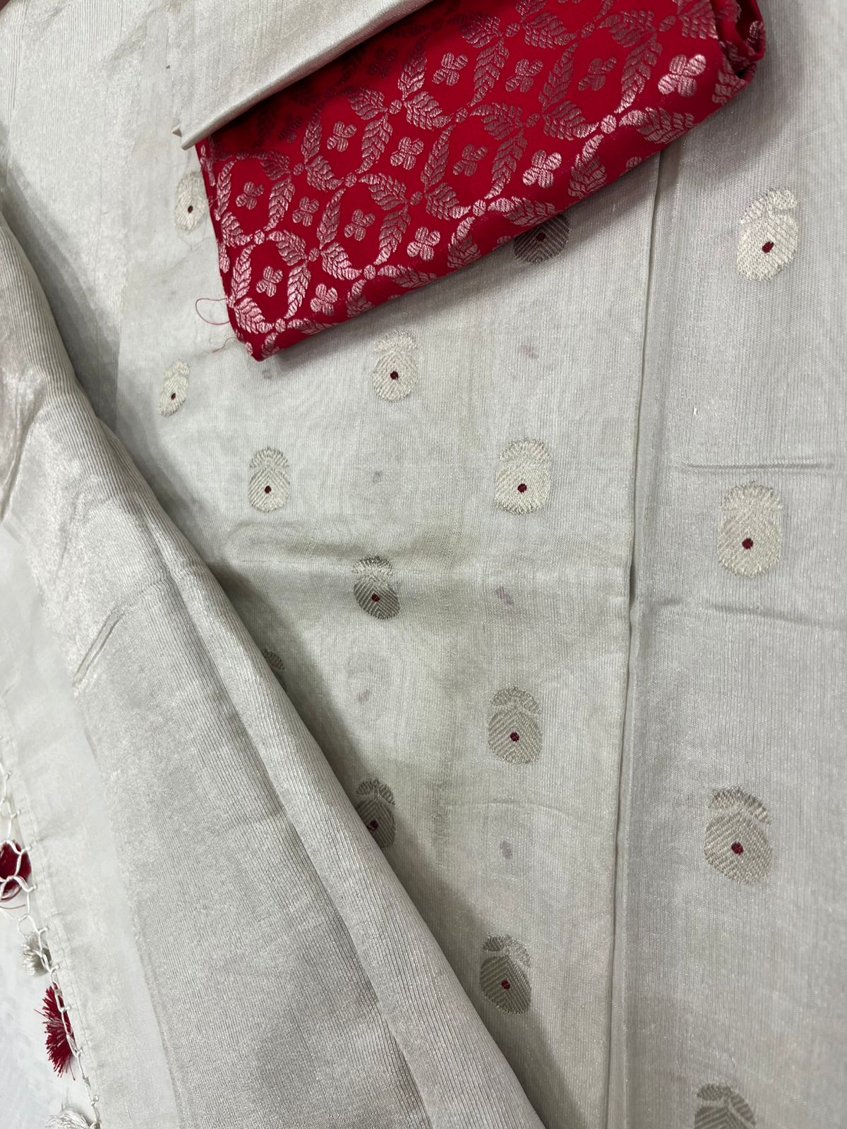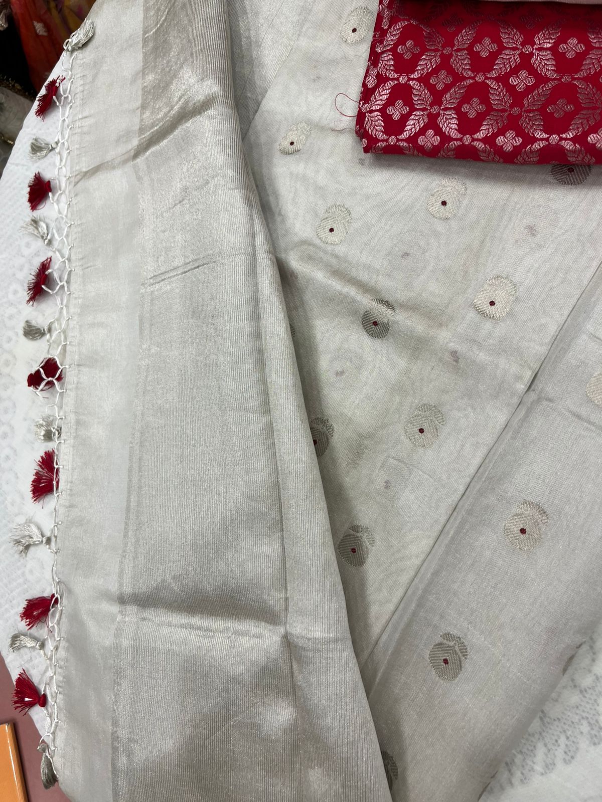 An epitome of understated luxury, this off-white tissue saree is crafted with a lustrous finish that exudes timeless elegance. The delicate weave shimmers beautifully, while subtle embroidered motifs across the body add a touch of refined detail. The pallu is finished with handcrafted tassels in red and silver, lending a playful yet graceful contrast.