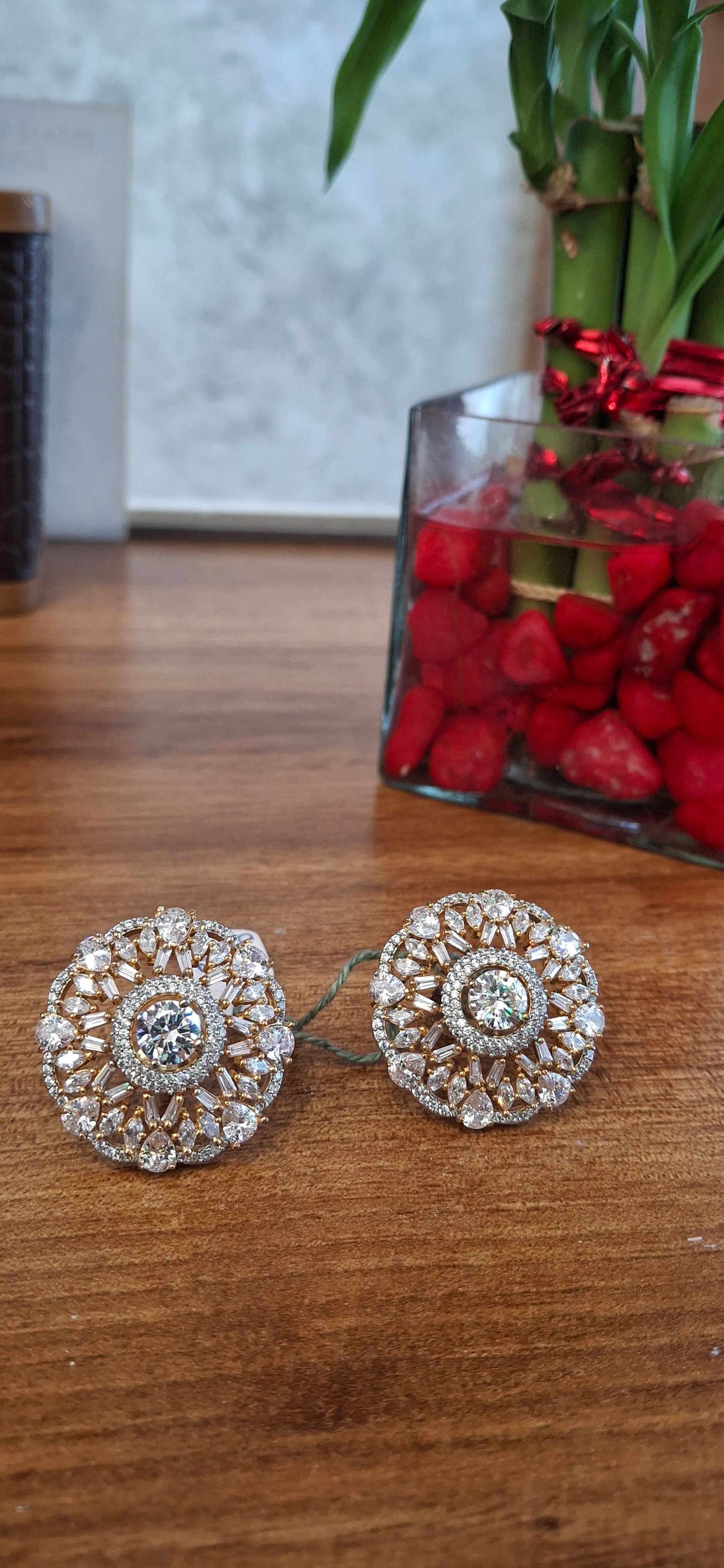 These stunning round statement studs are a perfect blend of elegance and sparkle. Crafted with intricate detailing, each earring features a brilliant central stone surrounded by concentric layers of sparkling crystals arranged in a floral sunburst pattern. Lightweight yet impactful, they’re ideal for festive occasions, cocktail nights, or when you simply want to add a touch of glamour to your look.