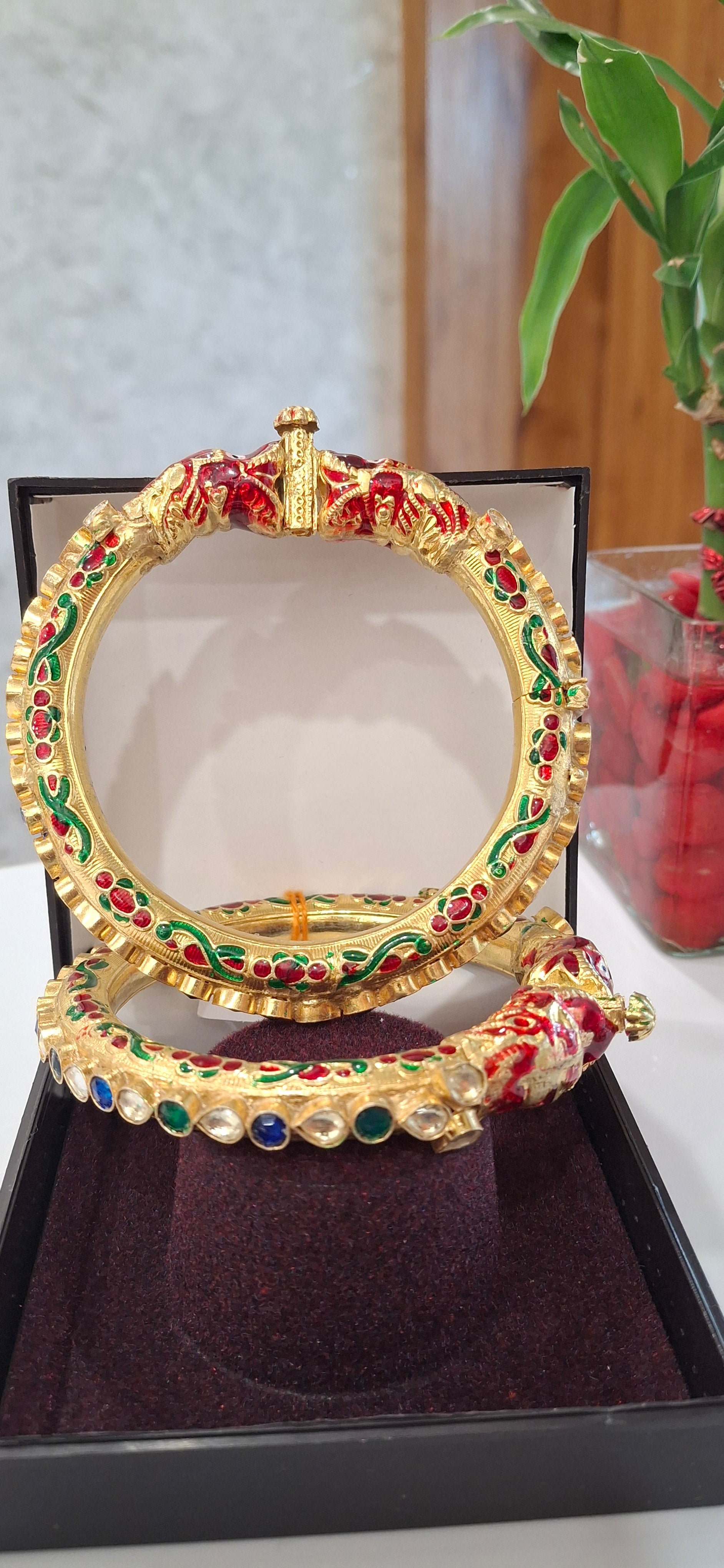 A regal statement steeped in heritage, this handcrafted Kundan Kada is a timeless treasure that brings together intricate artistry and vibrant charm. Set in a rich gold-tone base, it features floral enamel work in hues of green and red, detailed with mirror-cut kundan and delicate moti-style embellishments along the border.