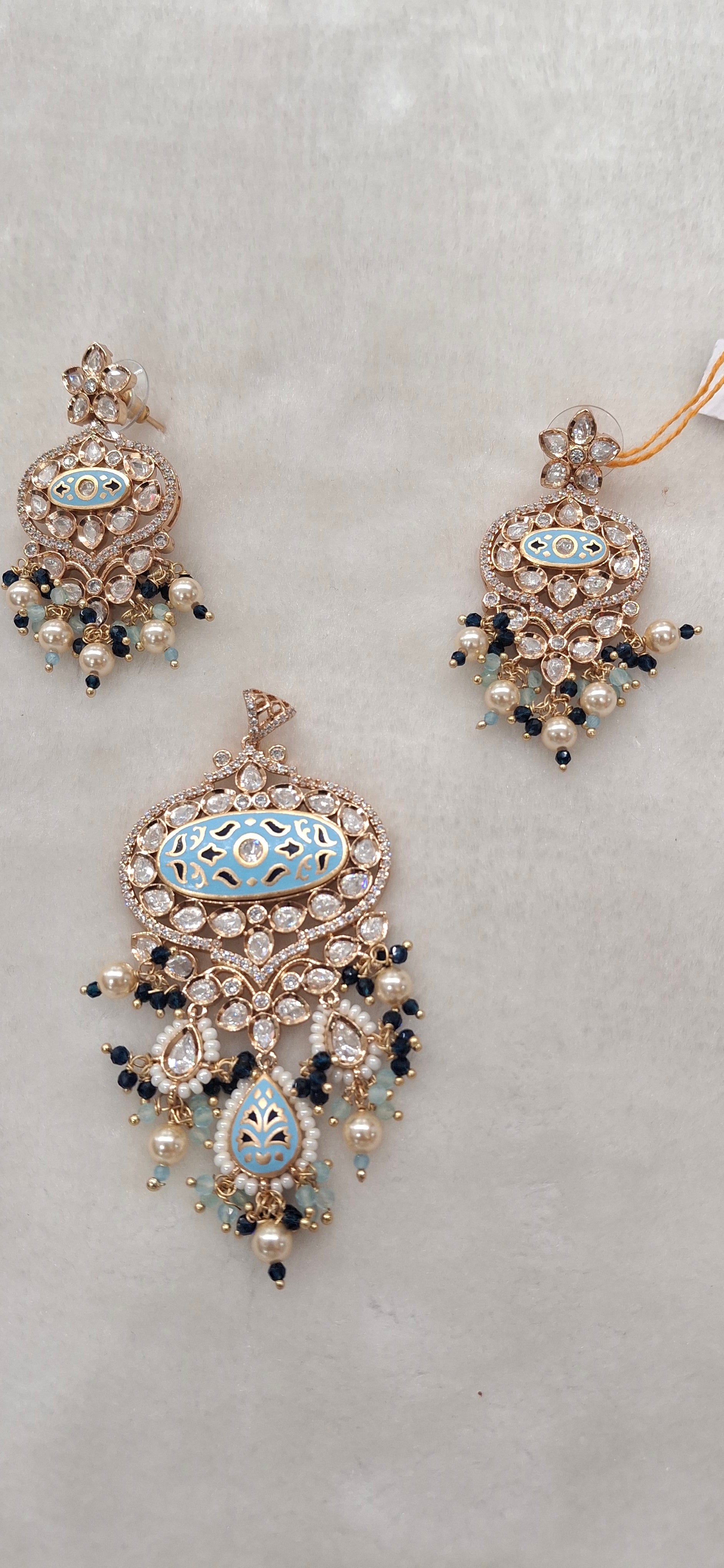 Radiating grandeur and timeless beauty, this multi-strand pearl necklace set is a masterpiece of traditional design. The necklace features intricately crafted kundan work with sparkling uncut stones arranged in floral and paisley motifs. The centerpiece pendant is adorned with a large oval stone framed by pearls and highlighted with teardrop elements, giving it a royal finish.