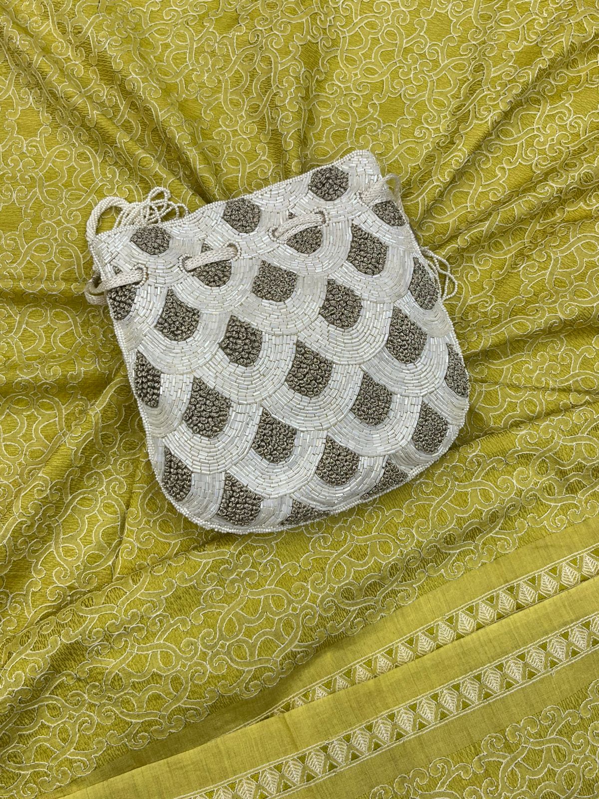 Munga silk is prized for its natural golden luster, strength, and durability, making this fabric not only visually stunning but also long-lasting. Ideal for creating sarees, dupattas, or formal ethnic wear, this fabric strikes a perfect balance between tradition and sophistication. The decorative white and silver beaded potli bag in the corner complements the opulence of the fabric, making it well-suited for festive or ceremonial occasions.